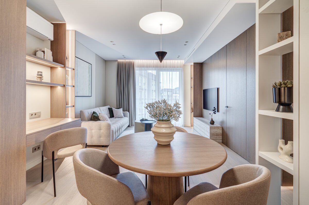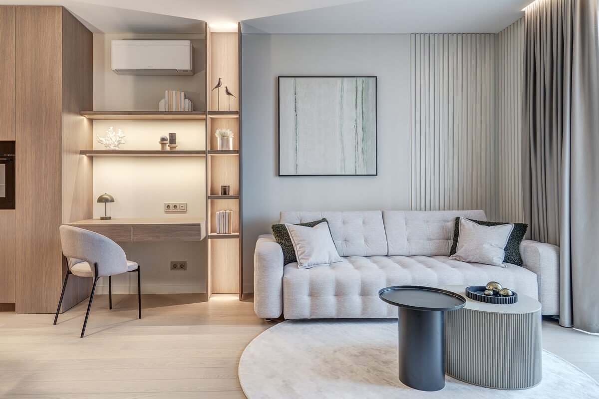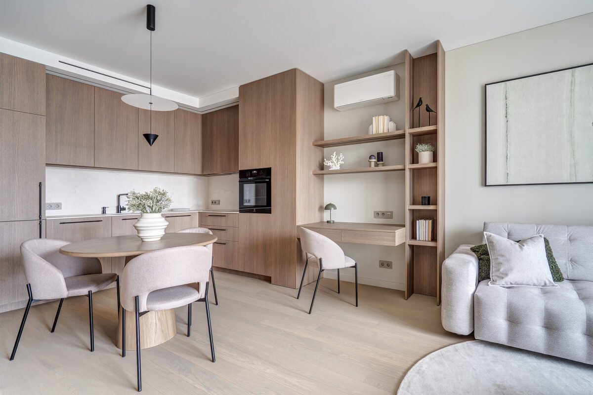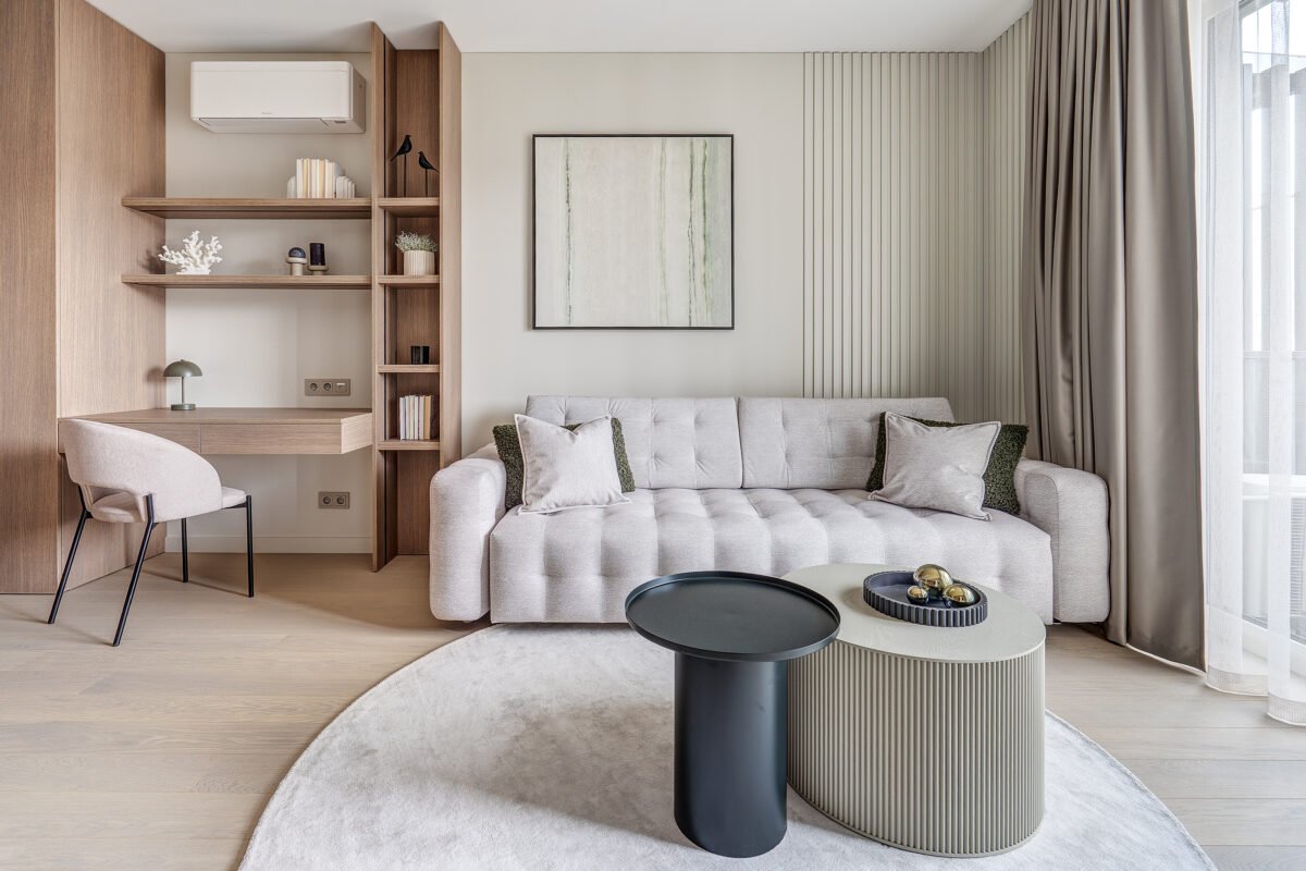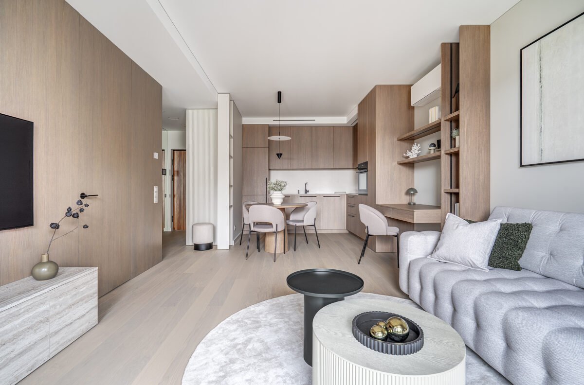47 kv.m. butas, kurio interjeras dvelkia ramybe, harmonija ir funkcionalumu. Apgalvotai suprojektuotas apšvietimas bei vientisa spalvinė gama kuria jaukią, šiuolaikišką, bet neperkrautą gyvenamąją erdvę, puikiai tinkančią tiek poilsiui, tiek darbui namuose.