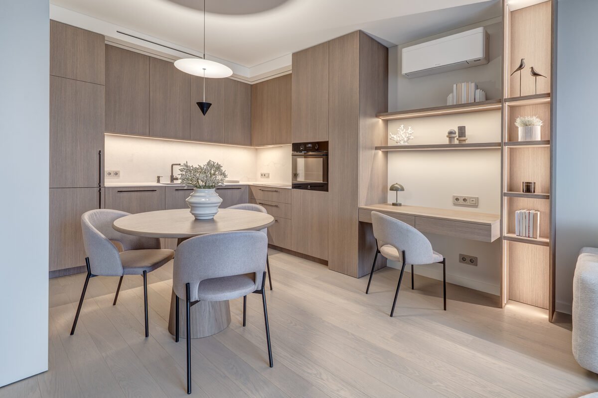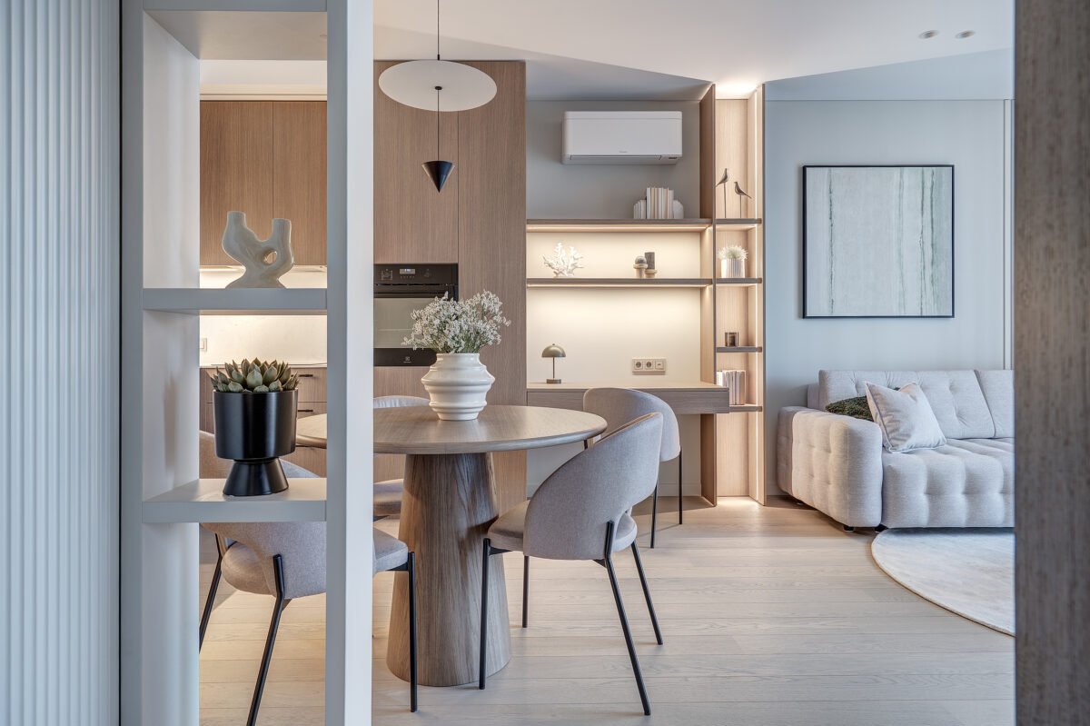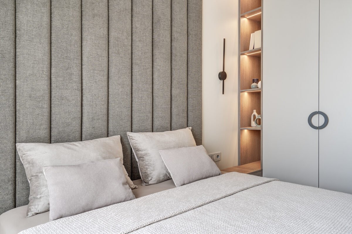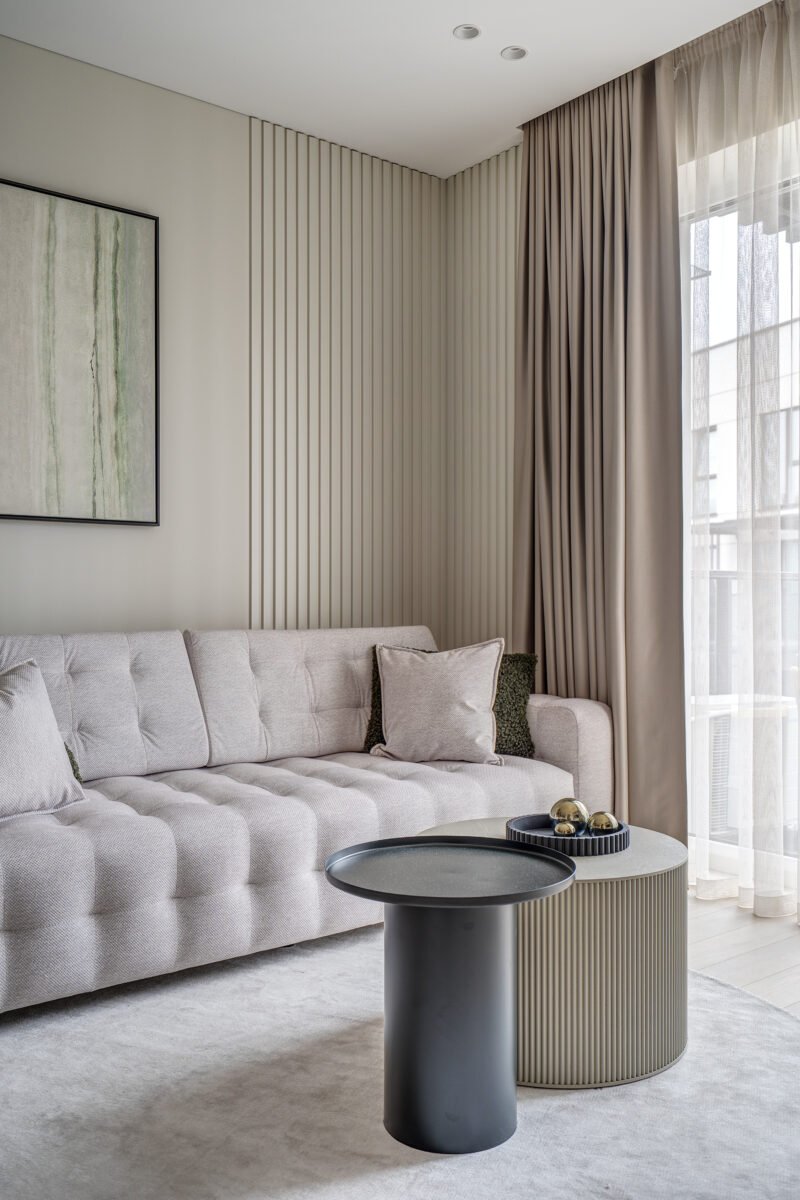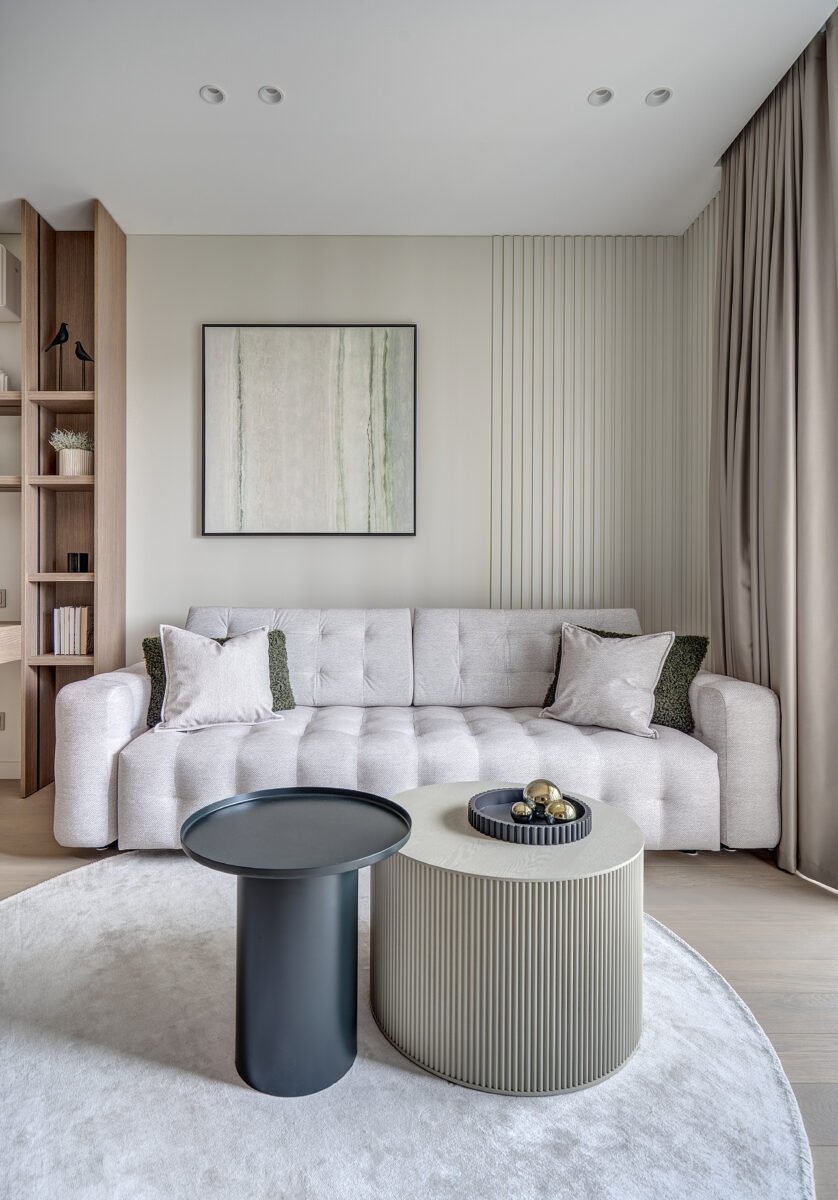 Interjere gausu dekoratyvinio apšvietimo, kuris ne tik suteikia jaukumo, bet ir subtiliai pabrėžia interjero bei dekoro detales. Švelni ir rami spalvinė paletė dominuoja visose erdvėse, o žali akcentai – tekstilėje, dekore ar augaluose – įneša gyvybės ir natūralumo pojūtį.