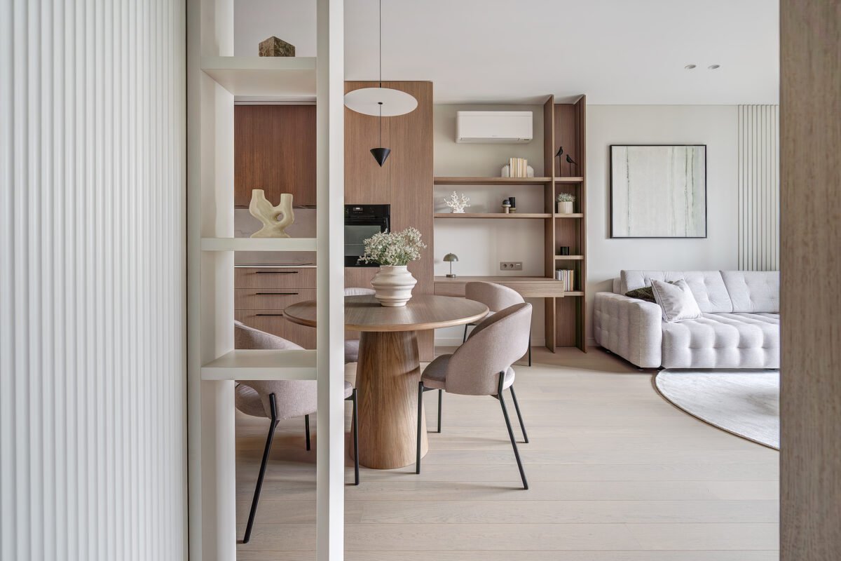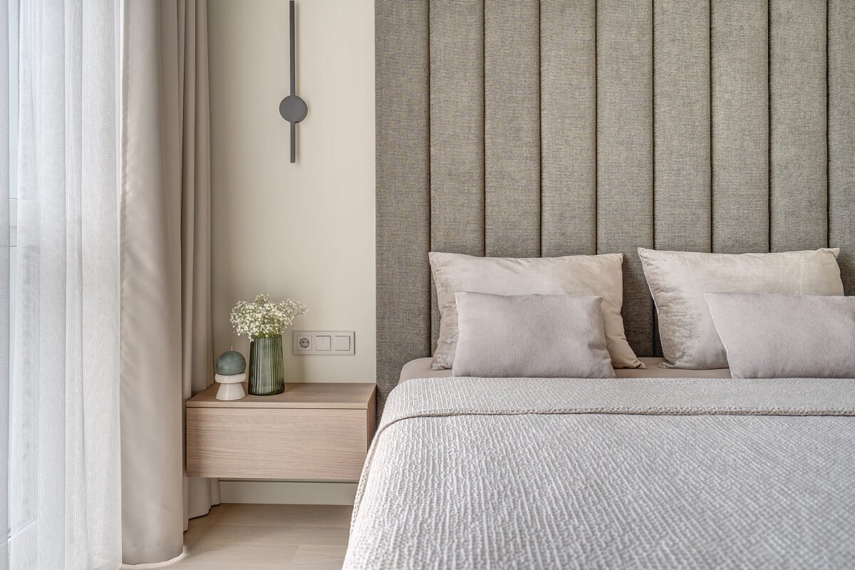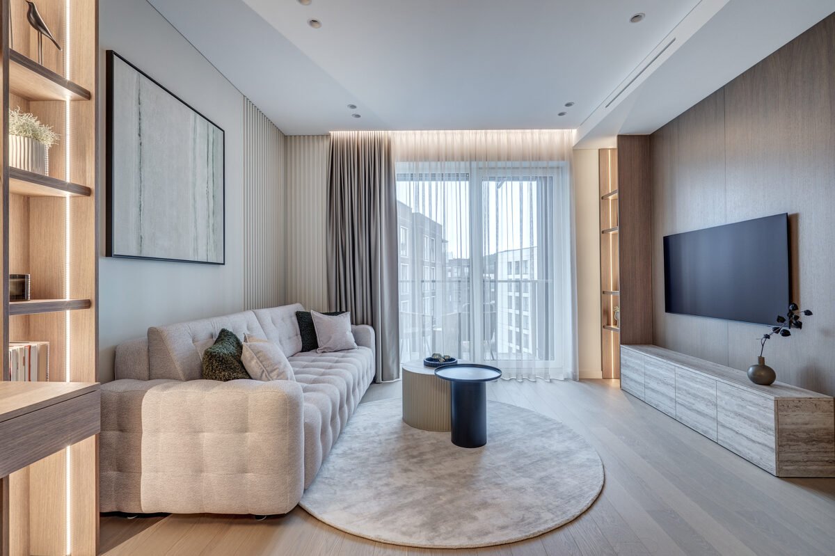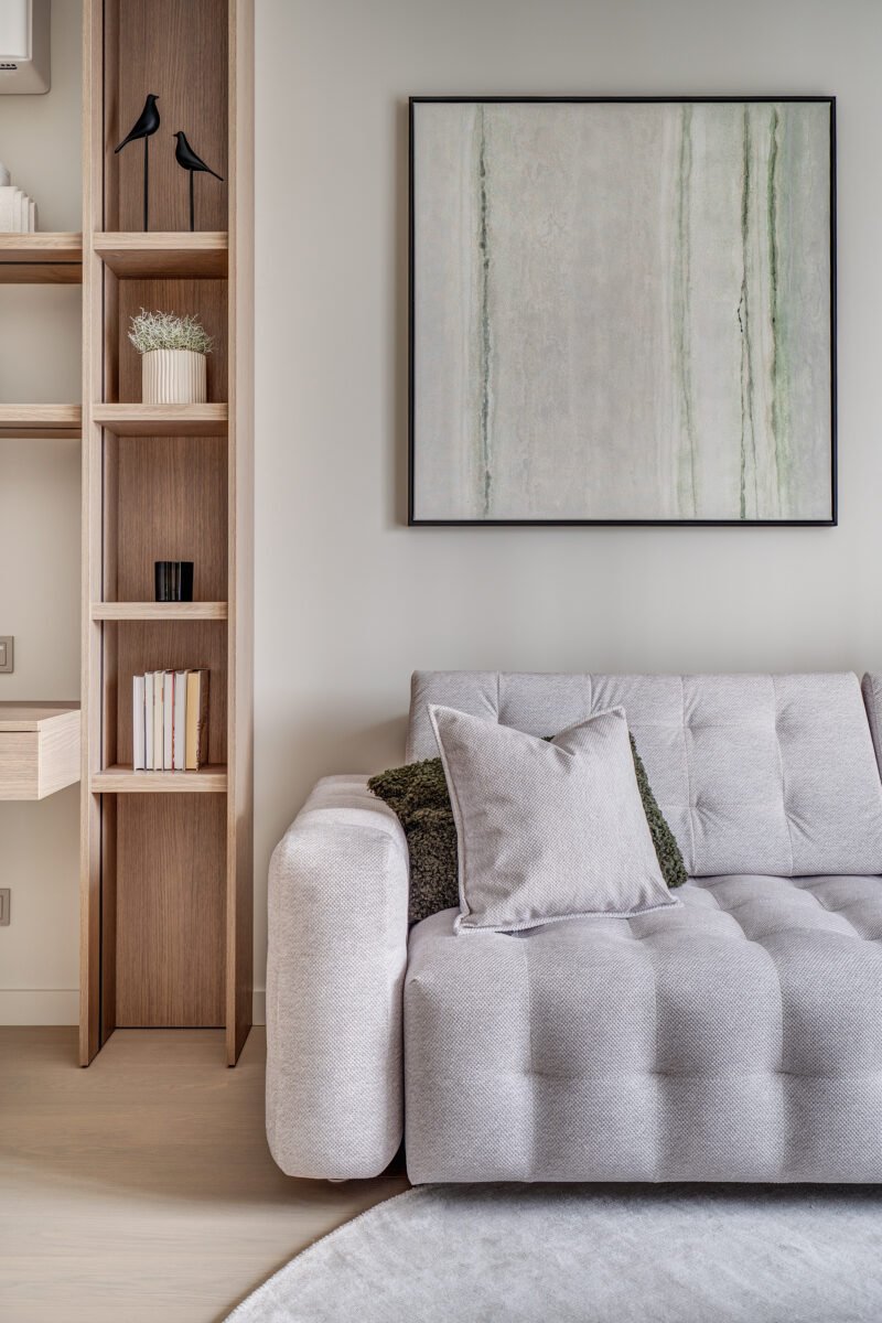 Interjere gausu dekoratyvinio apšvietimo, kuris ne tik suteikia jaukumo, bet ir subtiliai pabrėžia interjero bei dekoro detales. Švelni ir rami spalvinė paletė dominuoja visose erdvėse, o žali akcentai – tekstilėje, dekore ar augaluose – įneša gyvybės ir natūralumo pojūtį.