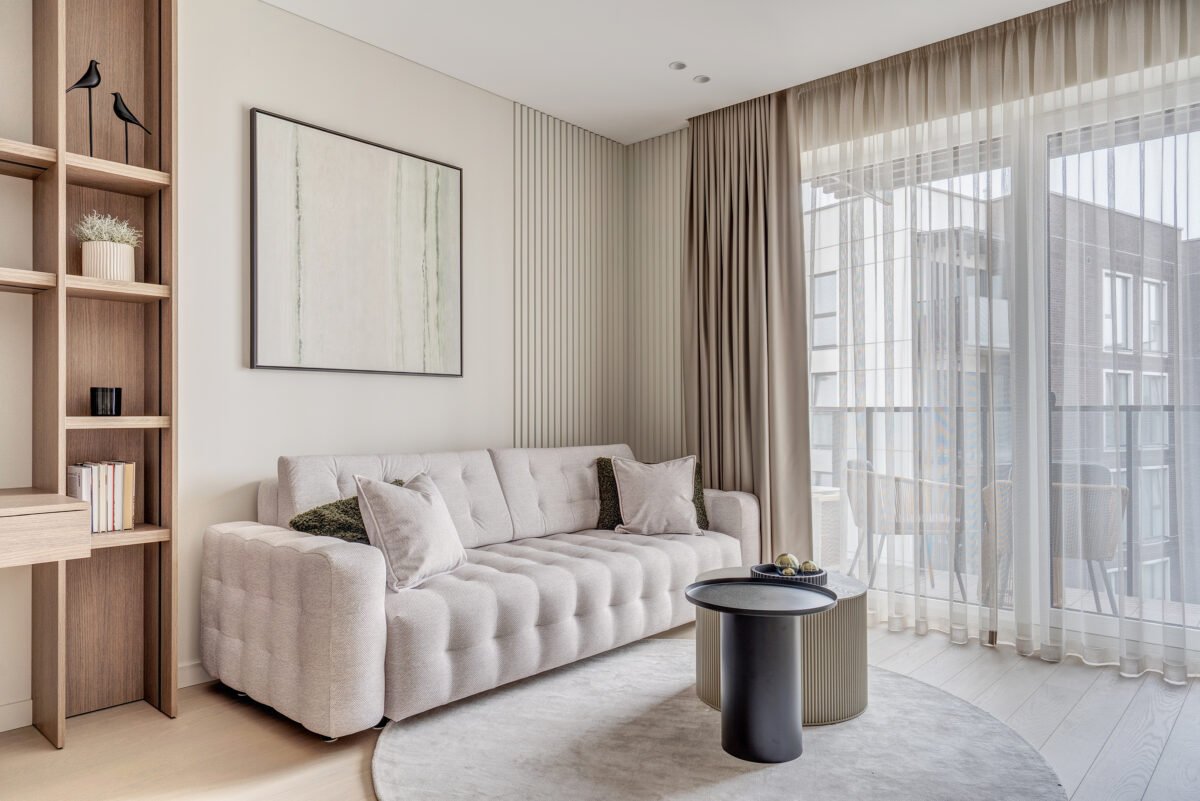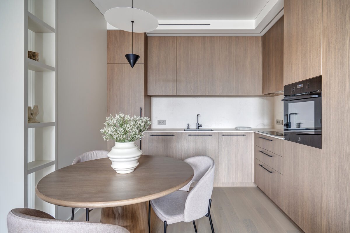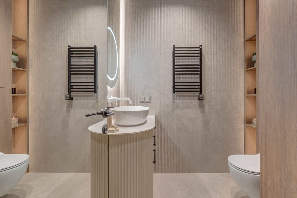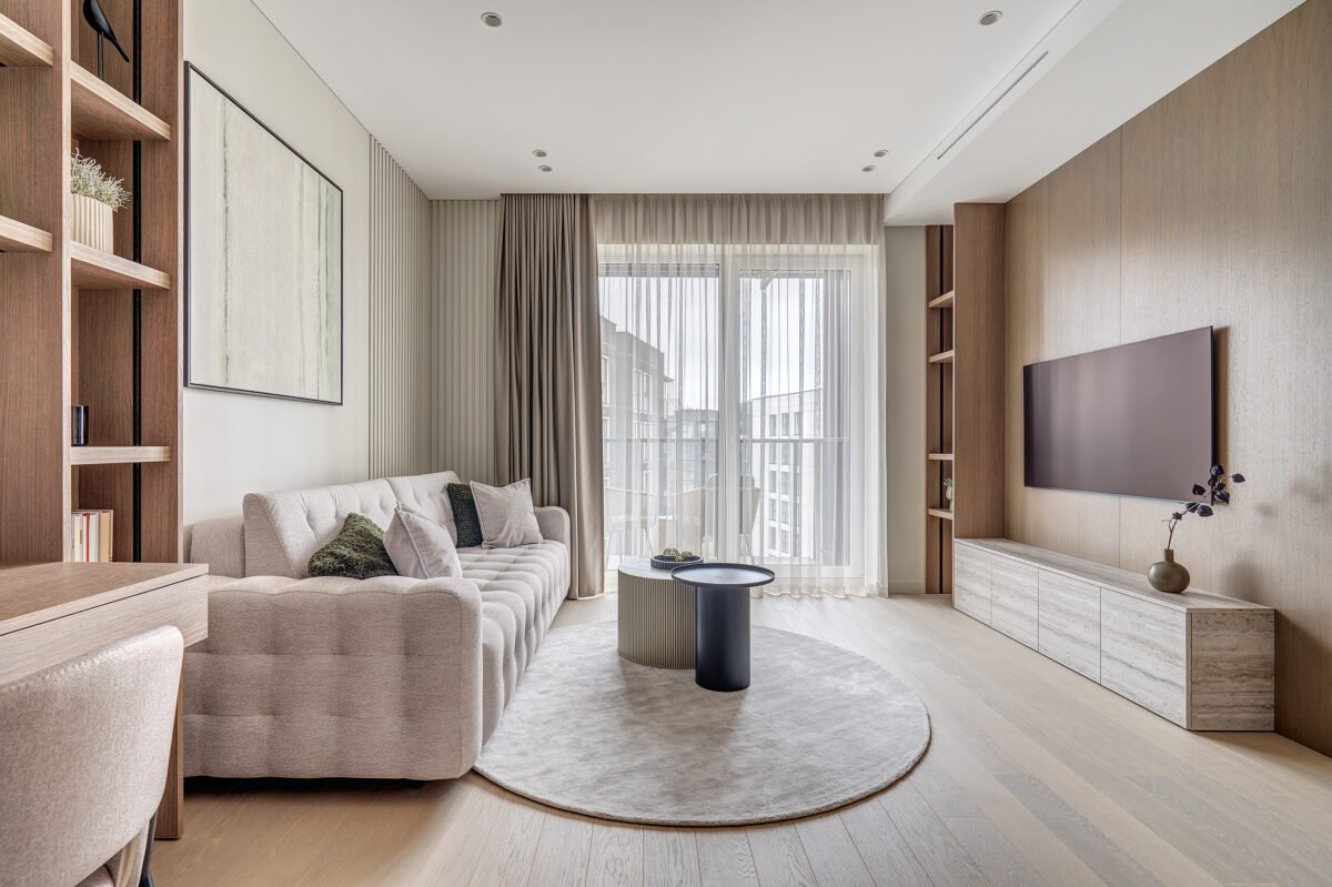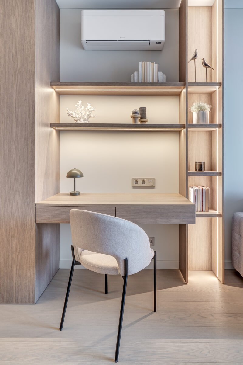 Interjere gausu dekoratyvinio apšvietimo, kuris ne tik suteikia jaukumo, bet ir subtiliai pabrėžia interjero bei dekoro detales. Švelni ir rami spalvinė paletė dominuoja visose erdvėse, o žali akcentai – tekstilėje, dekore ar augaluose – įneša gyvybės ir natūralumo pojūtį.