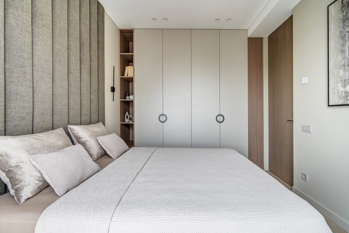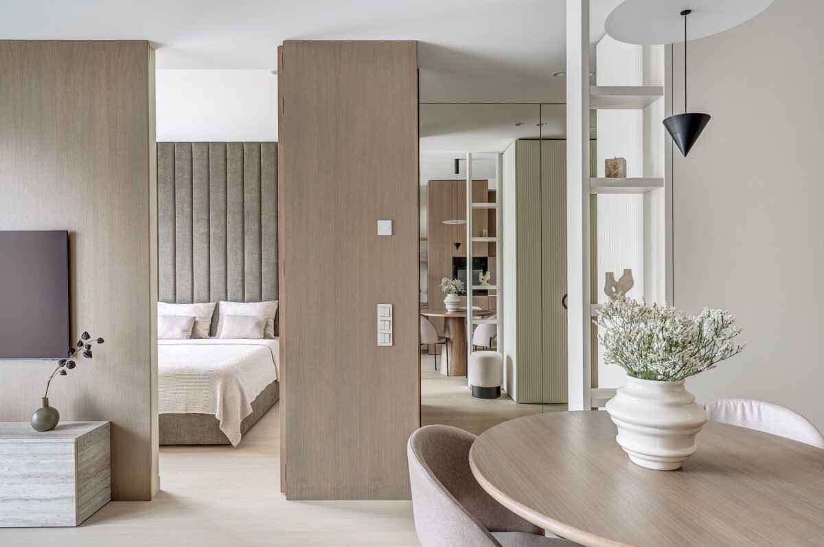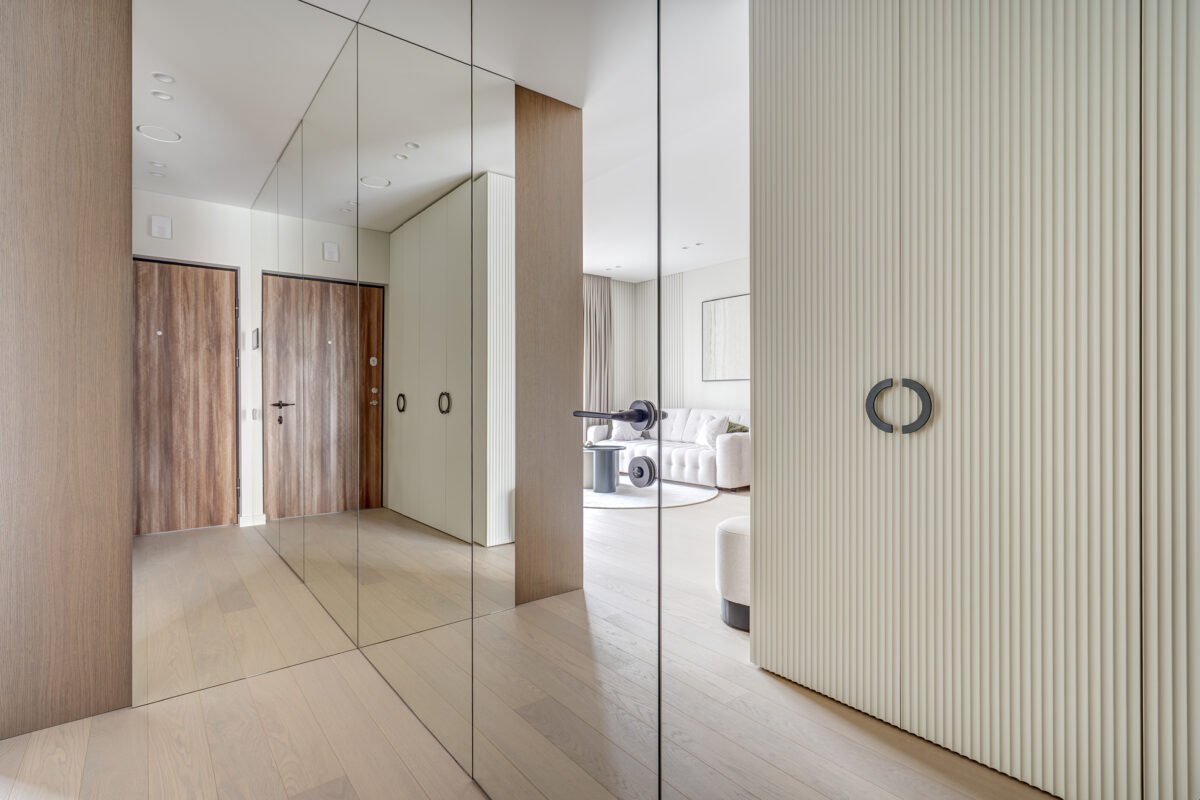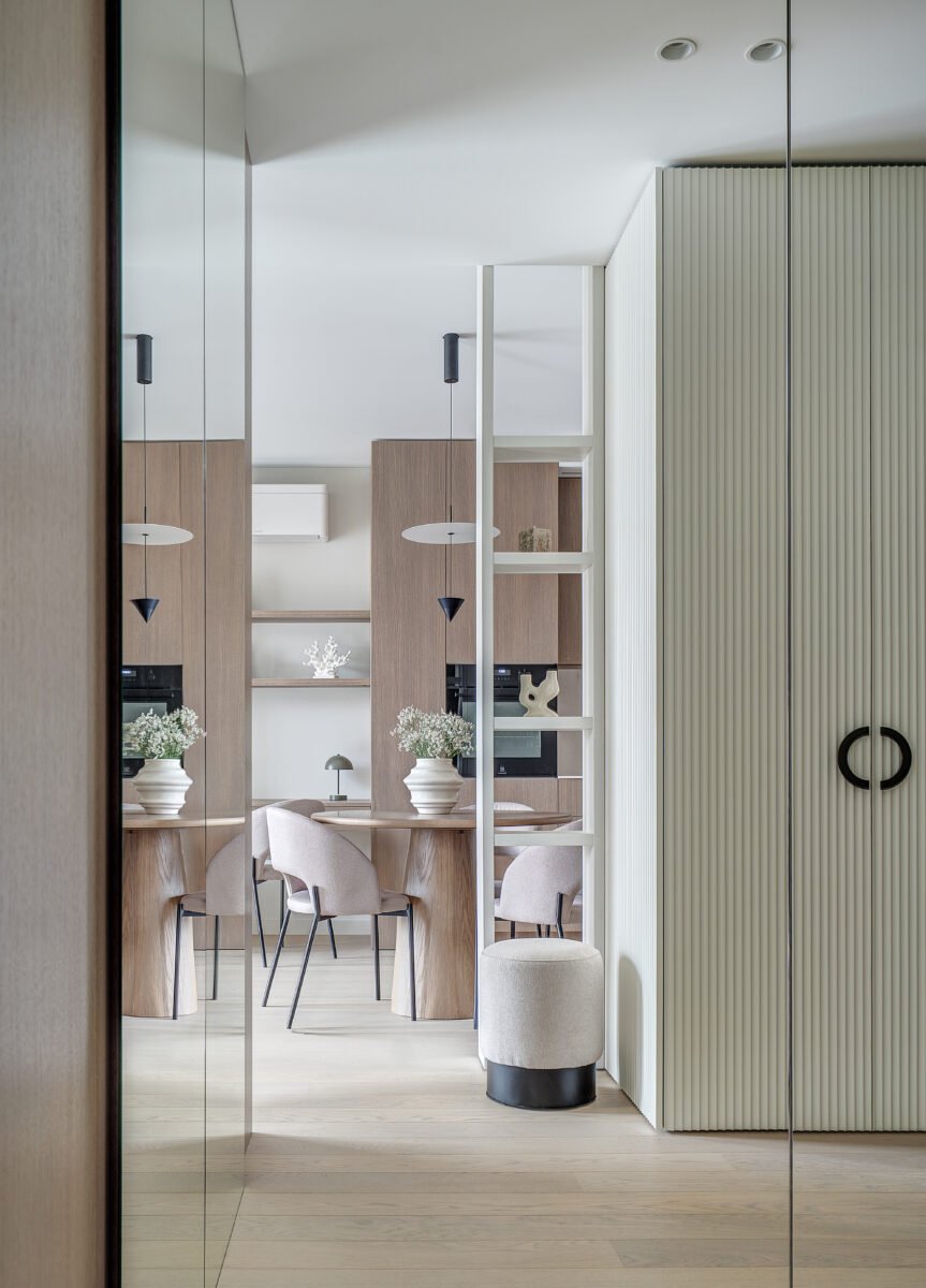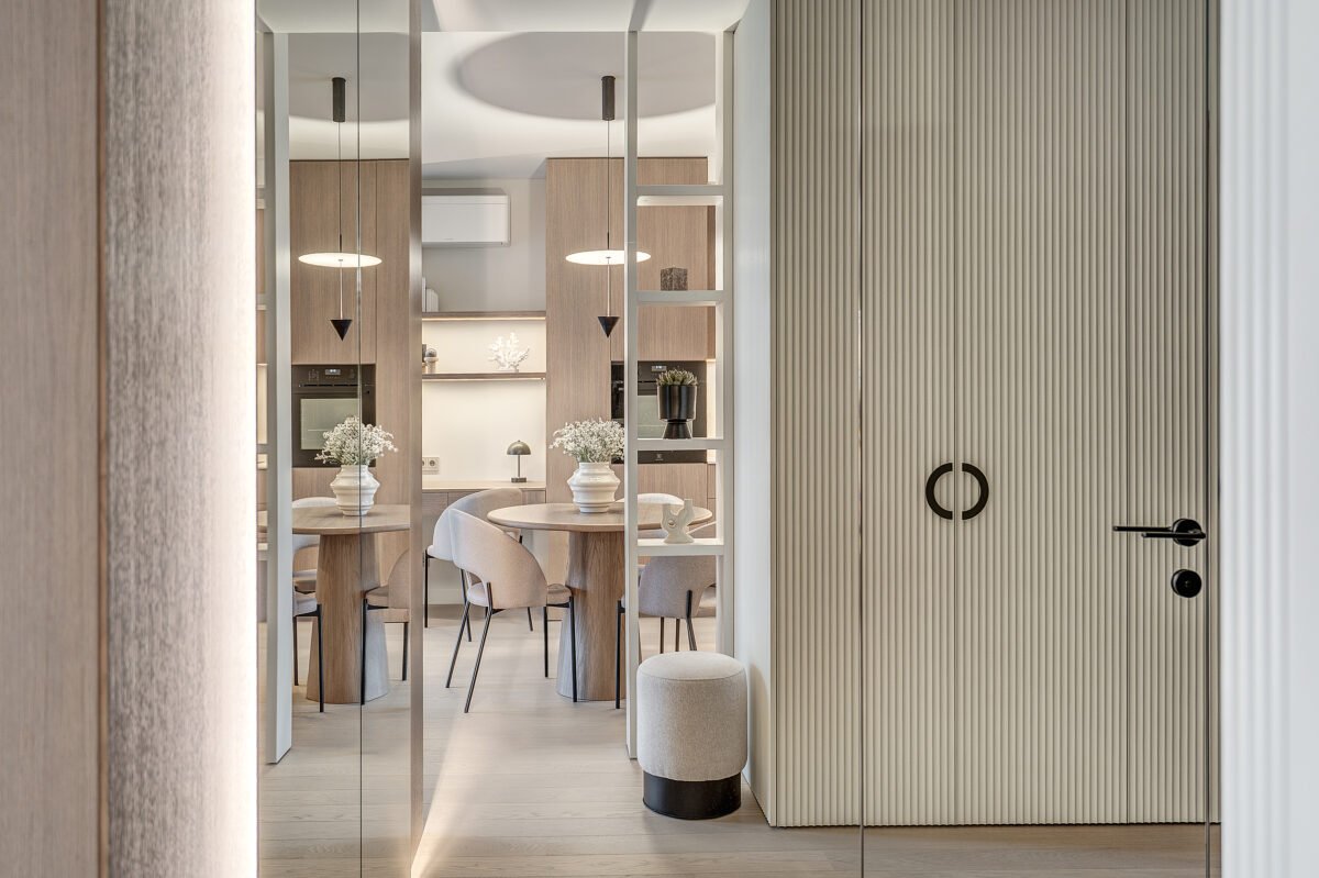 Pagrindinis šio būsto akcentas – veidrodinė siena su nematomomis durimis, kuri pereina į medžio lukštu dengtą plokštumą, taip pat su integruotomis, iš pirmo žvilgsnio akiai nepastebimomis miegamojo durimis. Šis sprendimas padeda išlaikyti estetinį vientisumą, o aukštos iki lubų durys tampa organiška interjero dalimi, nesudarydamos vizualinio trikdžio.