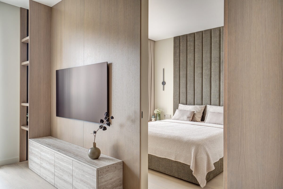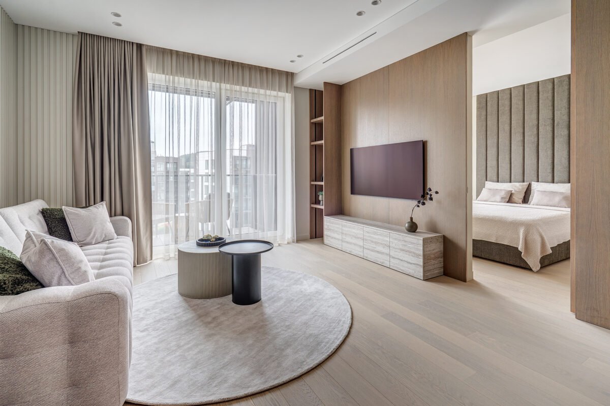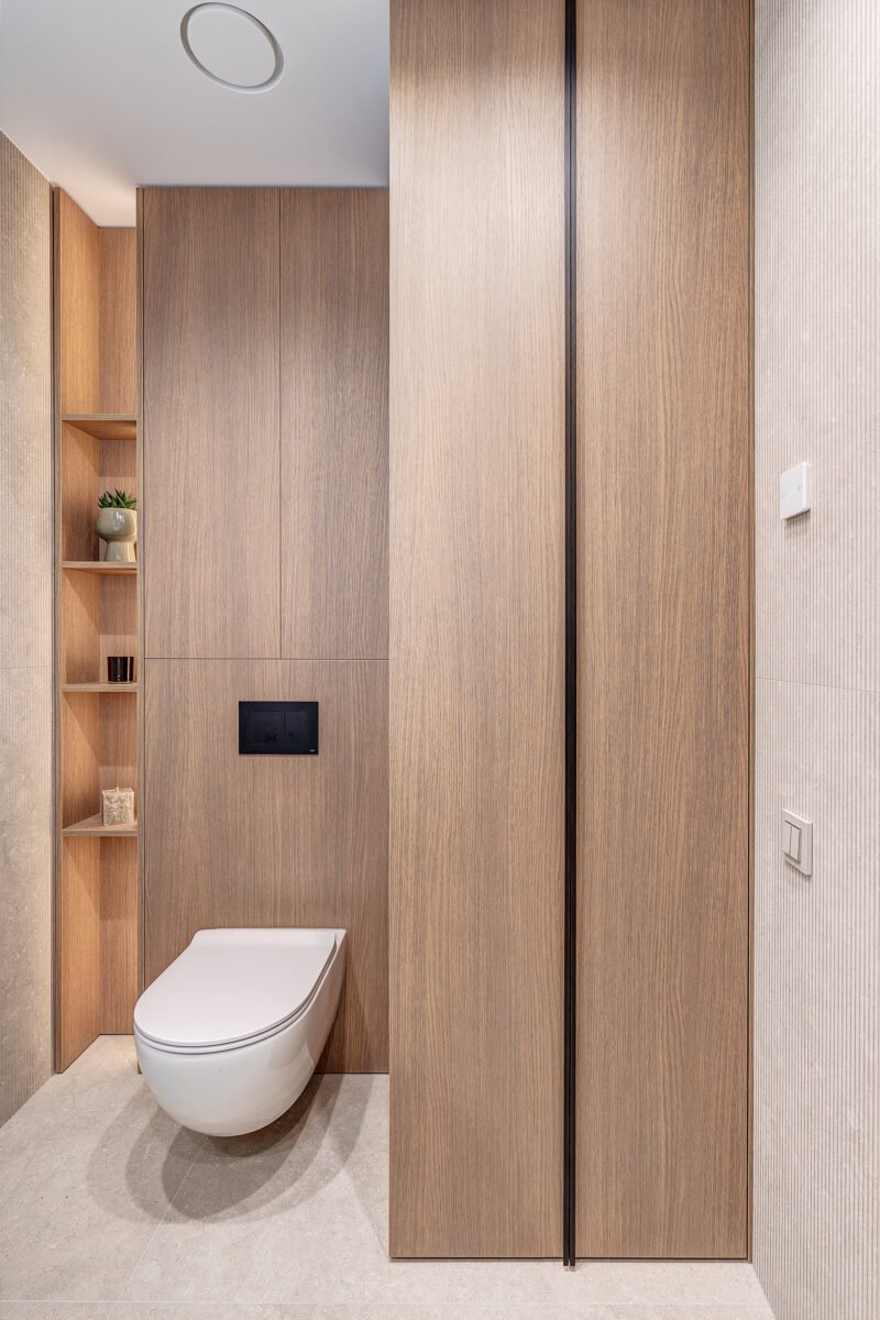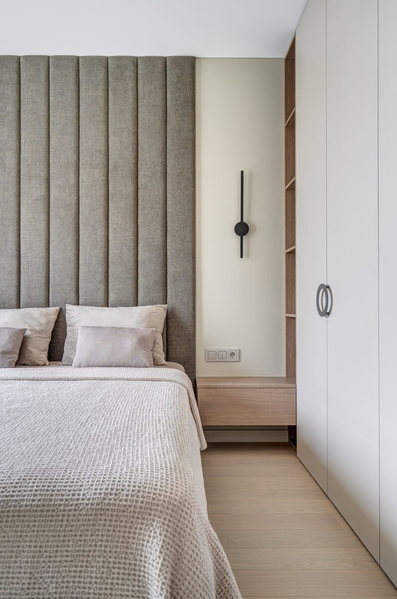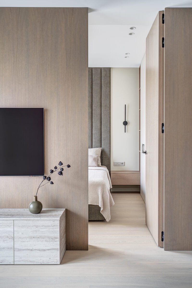 Pagrindinis šio būsto akcentas – veidrodinė siena su nematomomis durimis, kuri pereina į medžio lukštu dengtą plokštumą, taip pat su integruotomis, iš pirmo žvilgsnio akiai nepastebimomis miegamojo durimis. Šis sprendimas padeda išlaikyti estetinį vientisumą, o aukštos iki lubų durys tampa organiška interjero dalimi, nesudarydamos vizualinio trikdžio.