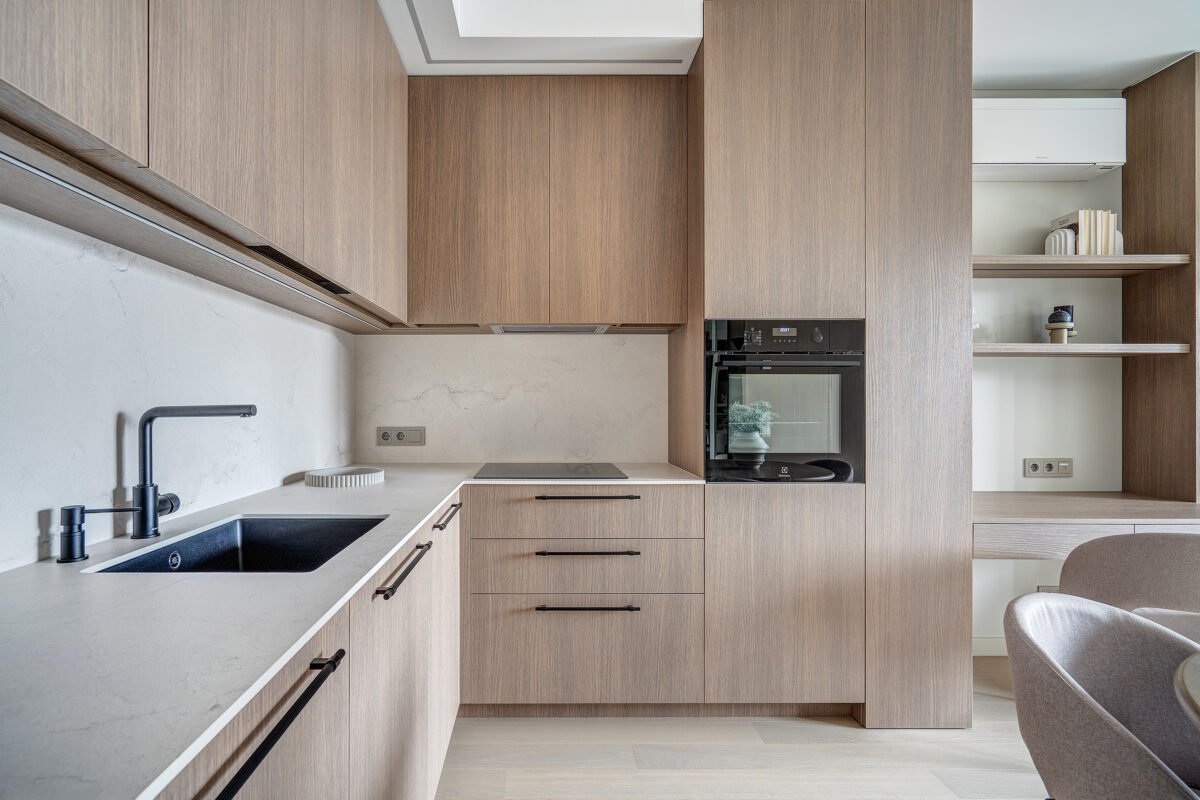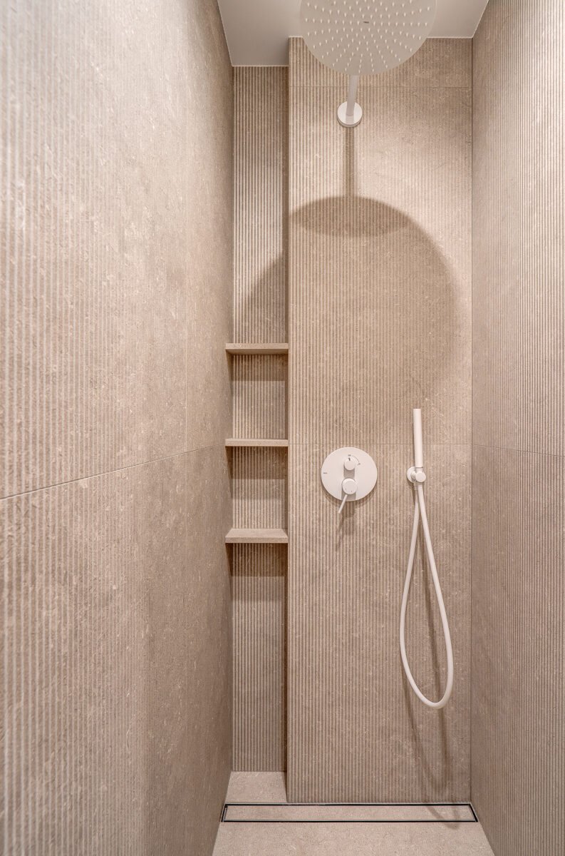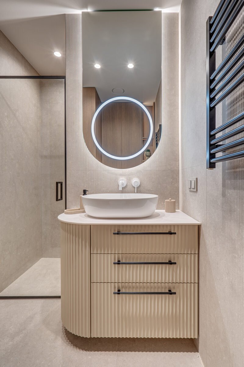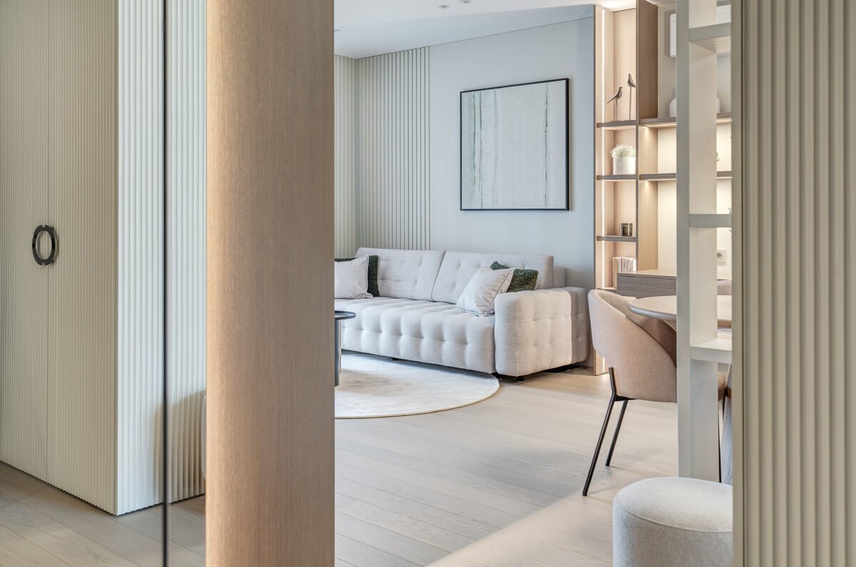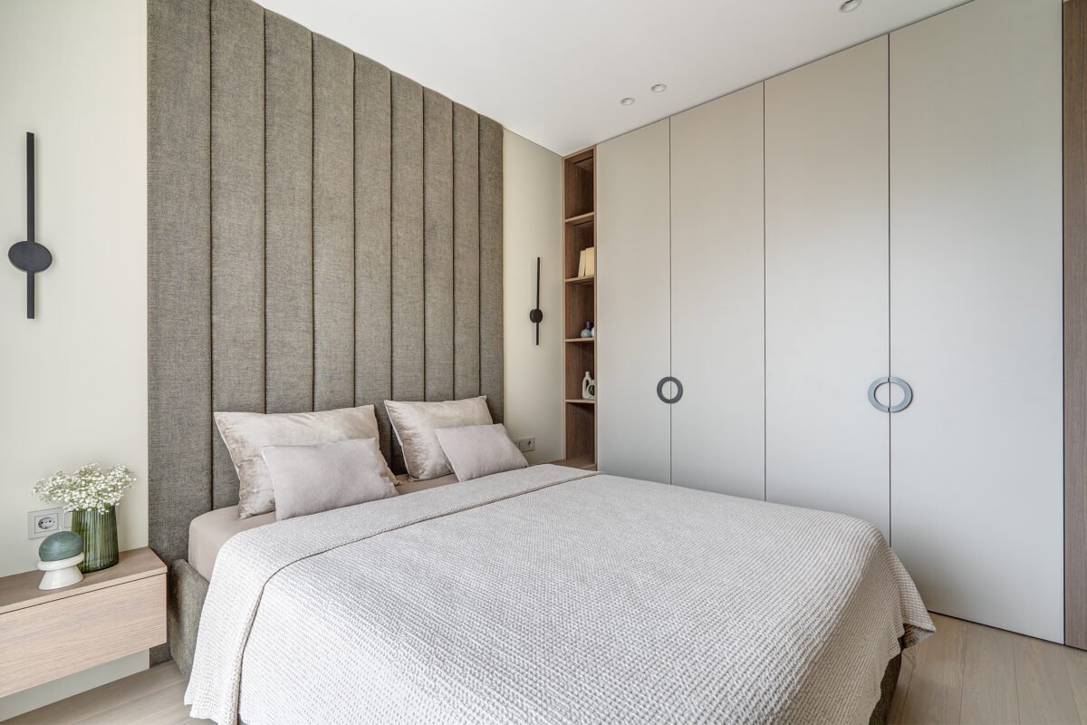 Pagrindinis šio būsto akcentas – veidrodinė siena su nematomomis durimis, kuri pereina į medžio lukštu dengtą plokštumą, taip pat su integruotomis, iš pirmo žvilgsnio akiai nepastebimomis miegamojo durimis. Šis sprendimas padeda išlaikyti estetinį vientisumą, o aukštos iki lubų durys tampa organiška interjero dalimi, nesudarydamos vizualinio trikdžio.