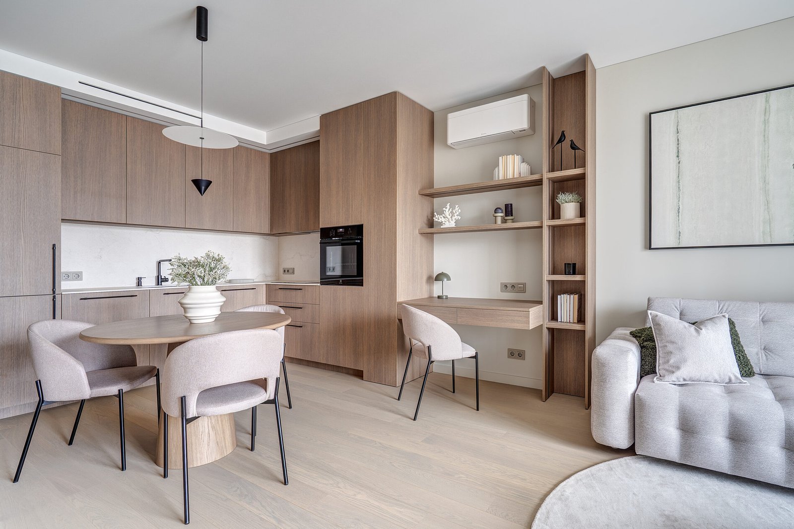 Interjere gausu dekoratyvinio apšvietimo, kuris ne tik suteikia jaukumo, bet ir subtiliai pabrėžia interjero bei dekoro detales. Švelni ir rami spalvinė paletė dominuoja visose erdvėse, o žali akcentai – tekstilėje, dekore ar augaluose – įneša gyvybės ir natūralumo pojūtį.