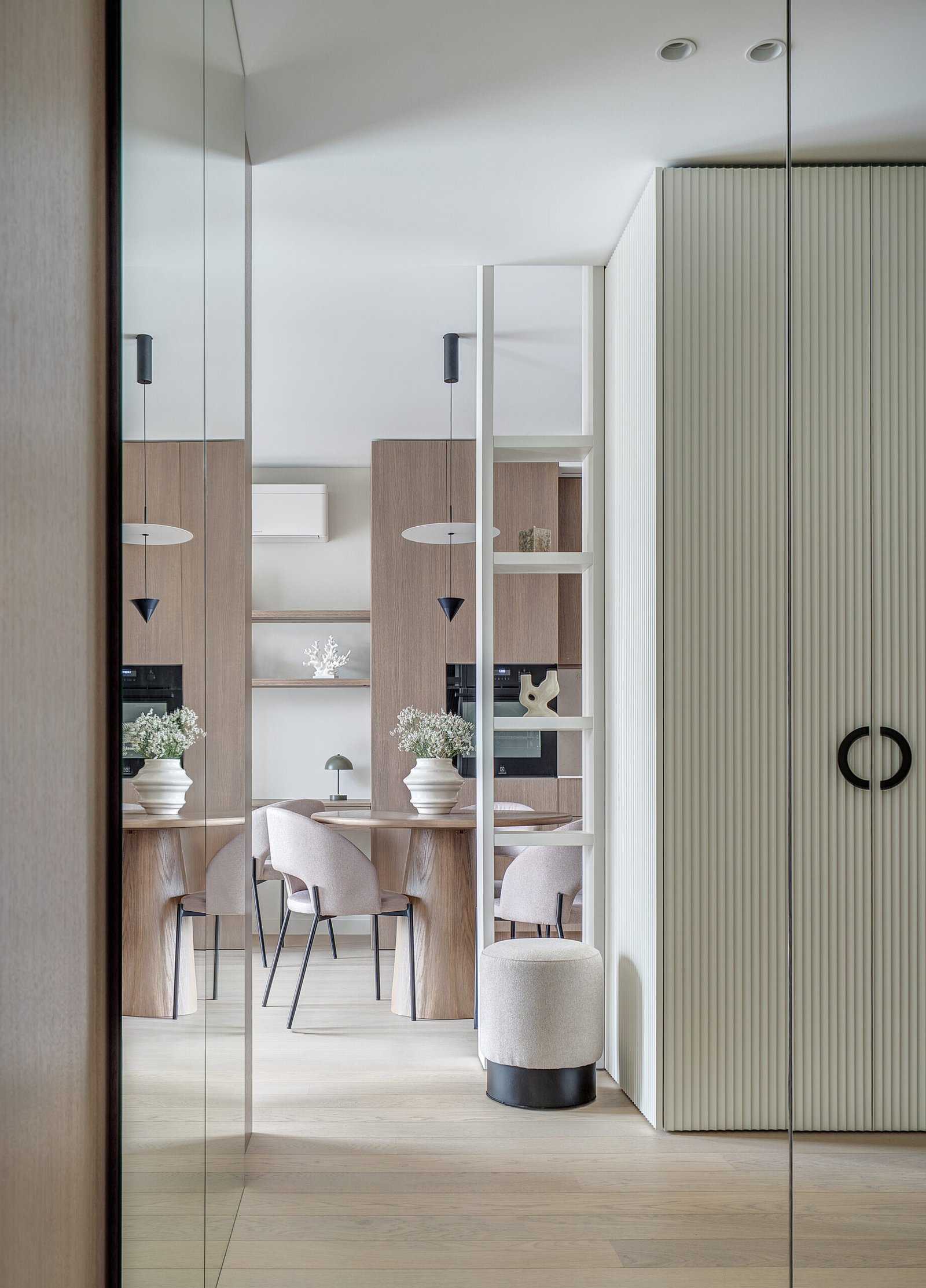 Pagrindinis šio būsto akcentas – veidrodinė siena su nematomomis durimis, kuri pereina į medžio lukštu dengtą plokštumą, taip pat su integruotomis, iš pirmo žvilgsnio akiai nepastebimomis miegamojo durimis. Šis sprendimas padeda išlaikyti estetinį vientisumą, o aukštos iki lubų durys tampa organiška interjero dalimi, nesudarydamos vizualinio trikdžio.